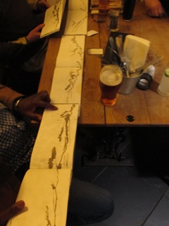 Day 3’s destination of Ben A’an in the Trossachs proved slightly harder to arrange, as bad weather forced the initial ‘Highland’ trips to be cancelled. When the slightly smaller group eventually ascended the peak, they were issued with pots of locally sourced oak-gall ink and used their locally sourced and prepared reed-pens to depict segments of the panoramic landscape in a series of interactive, collaborative drawings across the pages of each others sketchbooks.