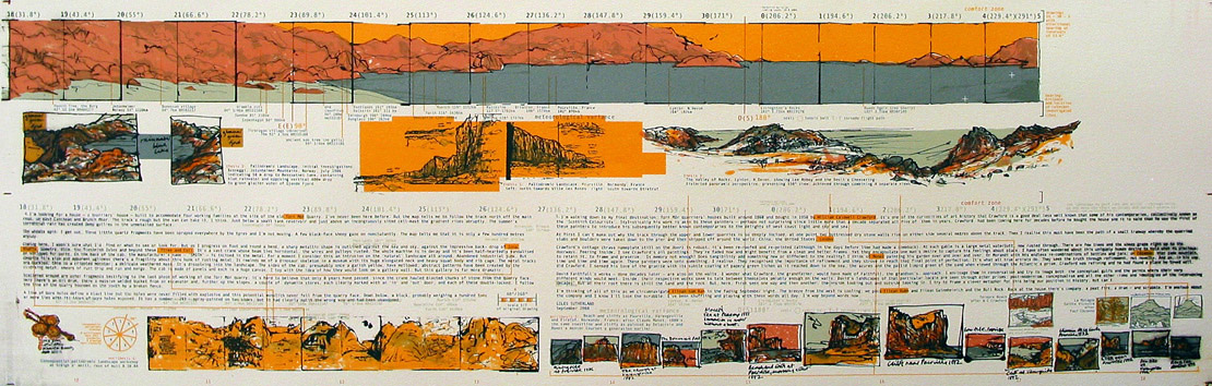 The accompanying Artists Book published to coincide witht the exhibition, contrasts the words of writer Giles Sutherland with his direct experience of visiting some of the sites depicted in the book.