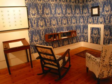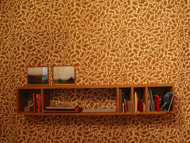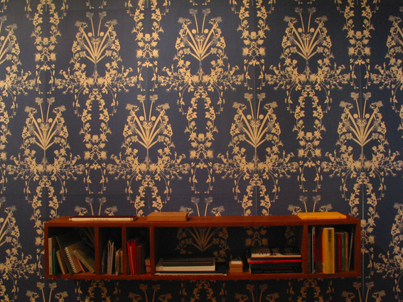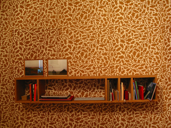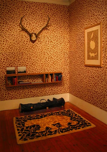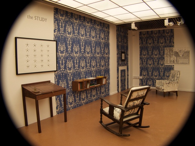 As part of his overall schema, Faithfull also conceived furniture (including shelving), wallpaper and other ‘decorative’ interventions. Thus, the Log Cabin contained printed hand-made wallpaper printed with an oak-leaf motif, a log bench, and a floor rug woven with a bear and oak-leaf design (itself a multiple woven in Iran). In the Study – which has a kind of Ruskinian ambience – we find a William Morris-inspired wallpaper by artist Nicola Murray derived not from Morris’s store of floral motifs but from a series of ‘mutated’ plants found in Murray’s allotment. These are complemented by comfortable floral pattern chairs, a putative ‘fireplace’ by Miranda Schofield (derived from the fireplace in one of Karl Marx’s former London homes) and a small, delicate writing desk.