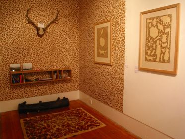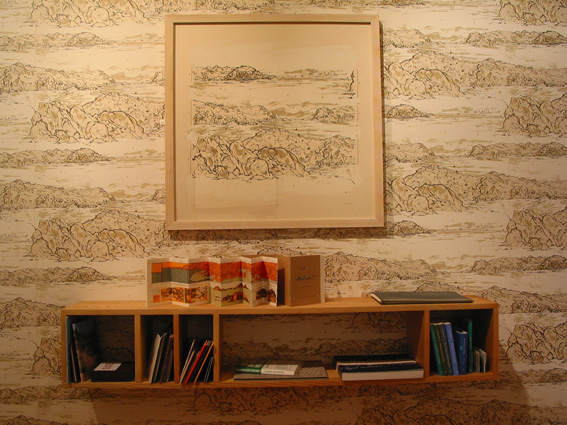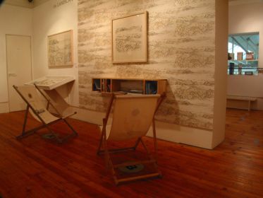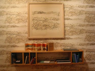 The bookshelves – themselves another form of multiple – are fashioned from reclaimed mahogany from Dundee University’s Chemistry laboratories, in contrast to the Log Cabin’s locally sourced oak and the Landscape’s sustainable ash. In the Landscape, the walls are decorated by paper derived from Faithfull’s own landscape drawings (made from ink made by Faithfull from oak galls) while, in keeping with the outdoor theme, the furniture consists of deck chairs. Landscape drawings, thematically linked to the wallpaper, adorn the walls.