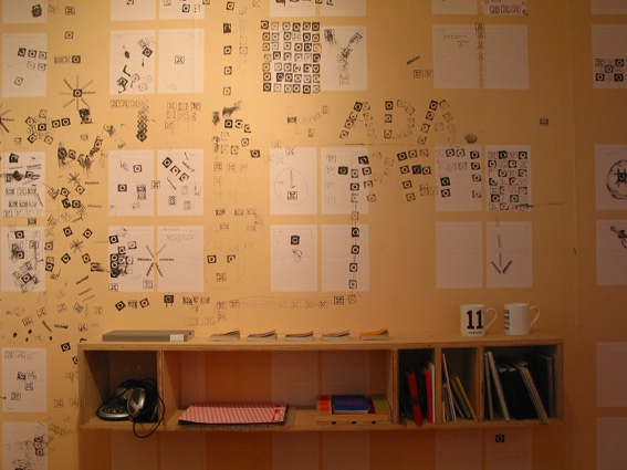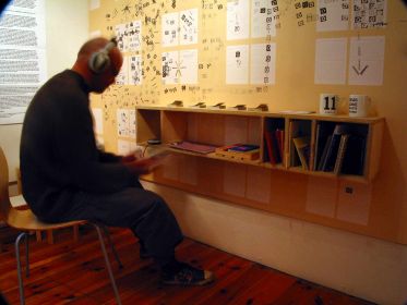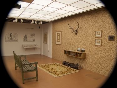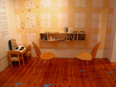 The Annexe, a repository of unclassifiable material, problematic material for any classification-addicted librarian, finds an appropriate taxonomy in this space, adorned with what appears to be astragalled window wallpaper in the fashion of the ‘seventies children’s TV programme, Playschool – is in fact an interactive wall diary by Chris Taylor and Craig Wood. This playful wall is complemented by a child’s work-table, also informing the viewers’ response and steam- bent, laminated plywood chairs. Here are filed the unclassifiable ‘picture books for grown-ups’ by Otto Dettmer as well as others, including, for instance, those relating to contemporary dance.