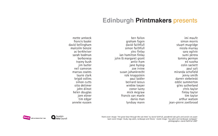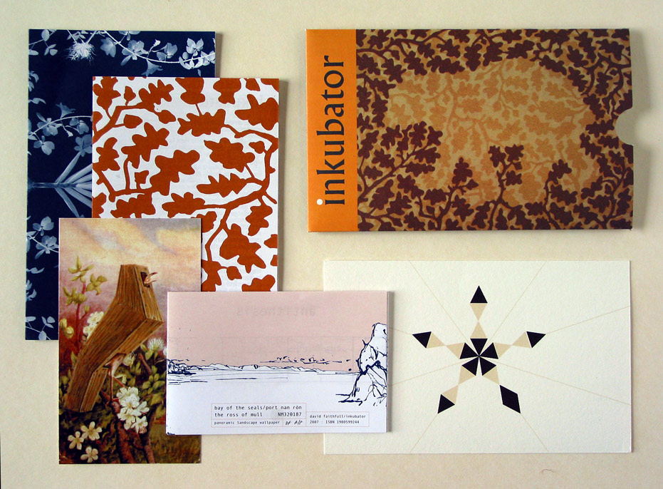In Inkubator 1, shown at Edinburgh Printmakers in 2007, Faithfull divided the available gallery space into three conceptual and actual spaces, with a fourth, termed the Annexe, as an addendum with material which did not easily fit into any of the three other categories. These groupings, or rooms, labelled Study, Log Cabin and Landscape, housed a plethora of printed and visual material.